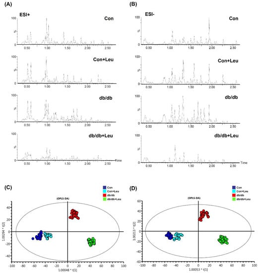 A global manner metabolites analysis using LC-MS, coupled with univariate and multivariate statistical analysis, was performed to generate the urine metabolomes among Con, Con + Leu, db/db, db/db + Leu groups. The representative base peak intensity chromatograms were obtained by scanning in electrospray positive-ion (ESI+) and electrospray negative-ion (ESI−) modes (Figure 5A,B). Orthogonal Partial Least Squares Discriminant Analysis (OPLS-DA) was further performed. The OPLS-DA score plots of ESI+ and ESI- modes (Figure 5C,D) showed that the clusters of Con and Con + Leu mice were quite closed, but the clusters between db/db and db/db + Leu mice were well-discriminated from each other.