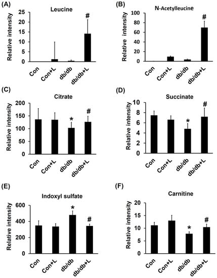 Urinary metabolites confirmed by MS/MS analysis in mice. Mice were sacrificed, and urine samples were harvested after 12 weeks of chew diet and normal drinking water. In mice treated with leucine, 1.5% w/v of leucine was added in the drinking water. The relative intensity of urinary leucine (A), acetyl-leucine (B), citrate (C), succinate (D), indoxyl-sulfate (E), and carnitine (F) of various groups are as shown. Data were presented as mean ± SEM. * p < 0.05, Con vs. db/db mice; # p < 0.05, db/db vs. db/db + L mice.