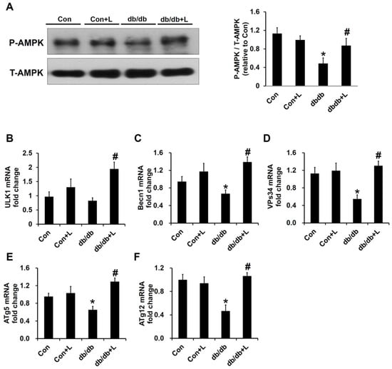 In db/db + Leu mice, phospho-AMPK and autophagy genes expression were increased compared with that of db/db mice. Mice were sacrificed, and kidneys were harvested after 12 weeks of chew diet and normal drinking water. In mice treated with leucine, 1.5% w/v of leucine was added in the drinking water. (A) Renal cortex tissue lysates were subjected to immunoblot analysis using specific antibodies against phospho-AMPK and total-AMPK. The relative abundance of phosphorylated AMPK was calculated by Image J. (B–F) qPCR analysis of the mRNA expression of the autophagy related genes, including ULK1 (B), Becn1 (C), VPs34 (D), ATg5 (E), and ATg12 (F). Data were expressed in fold relative to the expression in control mice. Data were presented as mean ± SEM, n = 5 in Con and Con + Leu (Con + L) groups; n = 6 in db/db and db/db + Leu (db/db + L) groups. * p < 0.05, Con vs. db/db mice; # p < 0.05, db/db vs. db/db + L mice.