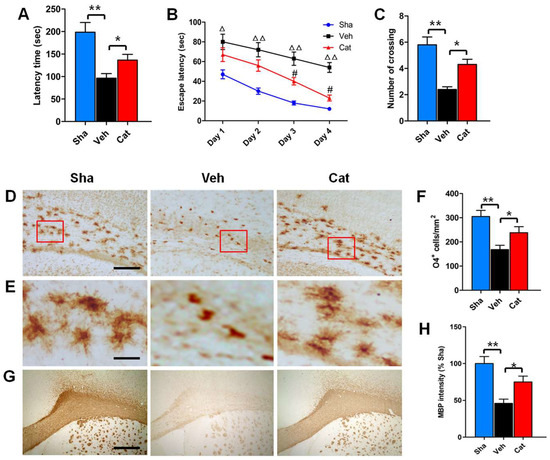 Effects of catalpol on behavioral outcome, premyelinating oligodendrocytes (PreOL) damage, and myelination in a rat model of neonatal hypoxia–ischemia. (A) Rotarod test of the latency time for remaining on the cylinder in the sham-control (Sha), vehicle-treated (Veh), and catalpol-treated (Cat) groups. (B) Morris water maze test of the escape latency to find the platform in the Sha, Veh, and Cat groups. (C) Number of crossings of the previous platform location in the Morris water maze test in the Sha, Veh, and Cat groups. (D) Representative O4 staining in the corpus callosum of the Sha, Veh, and Cat groups. Bar = 100 μm. (E) High magnification images of O4 staining in the corpus callosum of the Sha, Veh, and Cat groups. Bar = 25 μm. (F) Quantification of O4-positive cells in the corpus callosum of the Sha, Veh, and Cat groups. (G) Representative myelin basic protein (MBP) staining in the corpus callosum of the Sha, Veh, and Cat groups. Bar = 500 μm. (H) Quantification of the optical density of MBP staining in the corpus callosum of the Sha, Veh, and Cat groups. Data are shown as means ± SEM (n = 6 in each group). * p < 0.05, ** p < 0.01 vs. indicated group; △p < 0.05, △△p < 0.01 vs. Sha; #p < 0.05 vs. Veh.