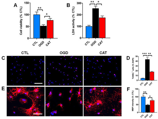 Effects of catalpol on PreOL survival and maturation under oxygen-glucose deprivation (OGD). (A) Quantification of cell viability as measured by the 3-(4,5-dimethylthiazol-2-yl)-2,5-diphenyltetrazolium bromide (MTT) assay in the control (CTL), OGD-treated (OGD), and catalpol-treated (CAT) groups. (B) Quantification of lactate dehydrogenase (LDH) activity in the CTL, OGD, and CAT groups. (C) Representative terminal deoxynucleotidyl transferase-mediated dUTP-biotin nick end labeling assay (TUNEL) staining (red) in the CTL, OGD, and CAT groups. Cell nuclei were counterstained with 4′,6′-diamidino-2-phenylindole (DAPI) (blue). Bar = 50 μm. (D) Quantification of TUNEL-positive cells in the CTL, OGD, and CAT groups. (E) Representative MBP staining (red) in the CTL, OGD, and CAT groups. Cell nuclei were counterstained with DAPI (blue). Bar = 25 μm. (F) Quantification of the optical density of MBP staining in the CTL, OGD, and CAT groups. Data are shown as means ± SEM (n = 6 in each group). * p < 0.05; ** p < 0.01; *** p < 0.001.