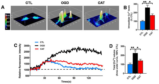 In addition, we also monitored the real-time changes in the intracellular Ca2+ response under 30 mM high-glucose stimulation. In the CTL group, intracellular Ca2+ concentrations showed a transient elevation and then rapidly returned to basal levels following high-glucose stimulation. By contrast, in PreOLs subjected to OGD, intracellular Ca2+ concentrations rose steadily throughout the period. The total volume of intracellular Ca2+ in the OGD group was strongly increased, as shown by the markedly elevated area under the curve compared to the CTL group (p < 0.01). Treatment with catalpol improved the recovery of Ca2+ concentrations toward to basal levels under high-glucose stimulation. The total volume of intracellular Ca2+ was significantly decreased following catalpol treatment, as demonstrated by the decreased area under curve compared with the OGD group (p < 0.05) (Figure 3C,D). These data demonstrated that catalpol protects PreOLs against OGD-induced injury by normalizing intracellular Ca2+ levels.