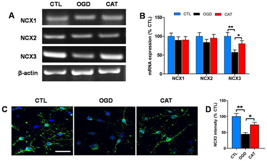 To determine whether catalpol inhibits intracellular Ca2+ elevation by regulating the functions of NCXs, RT-PCR was performed to analyze the mRNA levels of NCX1, NCX2, and NCX3 in PreOLs on day 3 of differentiation. OGD injury or catalpol treatment had no significant effect on the expression levels of NCX1 and NCX2 mRNA. The mRNA level of NCX3 was significantly decreased in response to OGD (p < 0.01), and this decrease was effectively prevented by catalpol treatment (p < 0.05) (Figure 4A,B). Immunofluorescence staining was further used to investigate the protein expression of NCX3. Similarly, OGD caused a conspicuous reduction in NCX3 protein expression compared to the CTL group (p < 0.01). Administration of catalpol markedly abrogated the decreased expression of NCX3 relative to the OGD group (p < 0.05) (Figure 4C,D). Therefore, our results suggest that catalpol inhibits intracellular Ca2+ elevation likely by modulating NCX3 in PreOLs induced by OGD.