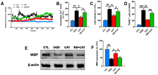Effects of catalpol on intracellular Ca2+ levels, cytosolic LDH activity, cell survival, and maturation of PreOLs under OGD and 2-[2-[4-(4-nitrobenzyloxy)phenyl]ethyl]isothiourea (KB-R7943) treatment. (A) Representative Ca2+ response traces under resting condition in the CTL, OGD, CAT, and KB-R7943+catalpol-treated group (KB+CAT) groups. (B) Quantification of intracellular Ca2+ levels at the resting condition measured by Fluo-3 staining in the CTL, OGD, CAT, and KB+CAT groups. (C) Quantification of LDH activity in the CTL, OGD, CAT, and KB+CAT groups. (D) Quantification of TUNEL-positive cells in the CTL, OGD, CAT, and KB+CAT groups. (E) Western blot probing for MBP in the CTL, OGD, CAT, and KB+CAT groups. β-actin was used as a loading control. The blot shown is representative of six independent experiments. (F) Quantification of MBP protein expression levels from the Western blot analyses. Data are shown as means ± SEM (n = 6 in each group). * p < 0.05; ** p < 0.01; *** p < 0.001.