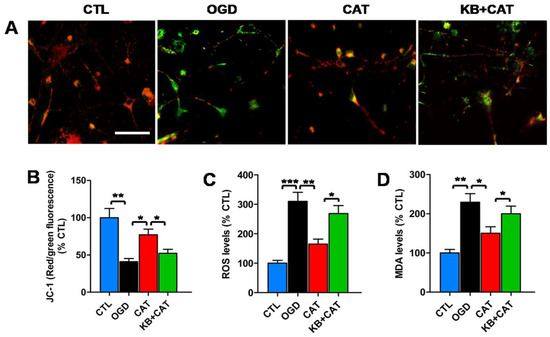 Ca2+-sensitive signaling pathways are associated with mitochondrion-mediated activation of ERK1/2 [29]. To further investigate the downstream mechanism of the protective effects of catalpol in PreOLs, we examined the alteration of ERK1/2 activation, which has been implicated in OGD-induced mitochondrial damage in PreOLs [24]. OGD markedly decreased mitochondrial membrane potential compared to the CTL group, as shown by the reduced red fluorescence (p < 0.01). Catalpol treatment significantly relieved the loss of mitochondrial membrane potential after OGD injury, as demonstrated by the increase in the red fluorescence ratio (p < 0.05), and this effect of catalpol was significantly inhibited in the presence of KB-R7943 (p < 0.05) (Figure 6A,B). The results of the dichlorodihydrofluorescein diacetate (DCFH-DA) assay showed that PreOLs in the OGD group exhibited a robust increase in reactive oxygen species (ROS) levels compared with the CTL group (p < 0.001). These elevated ROS levels were markedly reduced following catalpol treatment (p < 0.01). However, in the KB-R7943+catalpol-treated group (KB+CAT) group, the levels of ROS were significantly increased compared to those in the CAT group (p < 0.05) (Figure 6C). Similar to ROS, the levels of malondialdehyde (MDA) were much higher in the PreOLs subjected to OGD than in those from the CTL group (p < 0.01), and treatment with catalpol significantly inhibited this elevation (p < 0.05). Following NCX3 inhibition using KB-R7943, the decreased MDA levels were markedly elevated relative to the CAT group (p < 0.05) (Figure 6D).