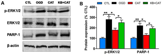 Effects of catalpol on the activation of the extracellular signal-regulated kinase 1/2 (ERK1/2) pathway in PreOLs under OGD and KB-R7943 treatment. (A) Western blot probing for p-ERK1/2 and poly-ADP-ribose polymerase-1 (PARP-1) from the CTL, OGD, CAT, and KB+CAT groups. Total ERK1/2 and β-actin were used as loading controls. The blot shown is representative of six independent experiments. (B) Quantification of p-ERK1/2 and PARP-1 protein expression levels from Western blot analyses. Data are shown as means ± SEM (n = 6 in each group). * p < 0.05; ** p < 0.01.
