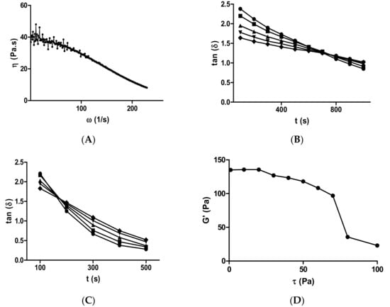 The flow behavior of the Si-HPMC solution showed that the steady shear viscosity decreased as the shear rate increased (Figure 1A). A Newtonian plateau observed at low shear rates was followed by a shear-thinning behavior. At a high shear rate, the viscosity exhibited power-law dependence with the shear rate. The flow curve could readily be fitted to the simplified Cross model using Equation (2) (correlation coefficient of 0.989). The limiting Newtonian viscosity (0) was 38.6 ± 1.2 Pa.s for a 4% (w/w) non-sterile Si-HPMC.