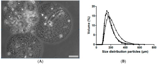 Cell encapsulation in biomaterials facilitates the injection of MSCs and decreases both the extensive cell death that tends to occur upon injection and the capacity of the MSCs to migrate [,]. In this study, MSCs were isolated from human adipose tissue, which contains relatively large numbers (5%) of MSCs []. For potential applications in biomedical engineering, it is essential to generate particles with optimal injection properties for in vivo studies: sphericity, reproducibility, and size monodispersity.