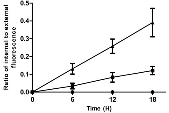 At the beginning of the experiment, the Si-HPMC particles did not exhibit any fluorescence, which is in agreement with the absence of fluorescence signals emanating from the Si-HPMC polymer. An increase in fluorescence intensity was then noticed as a function of time for the Si-HPMC particles incubated with 20 kDa and 250 kDa FITC-dextrans (Figure 3). After 18 h, the internal to external ratio was 0.39 and 0.1 for the 20 kDa and the 250 kDa fluorescently labeled dextrans, respectively. In addition, no fluorescence was detected inside the Si-HPMC particles after 18 h for the fluorescently labeled 2000 kDa dextran.