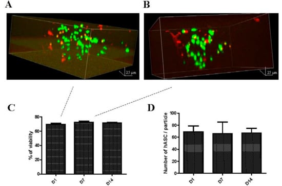 Human adipose-derived stromal cells (hASCs) viability after encapsulation in a Si-HPMC particle. Viable (green) and dead (red) cells were imaged using confocal microscopy and a Live/Dead assay kit at D1 (A) and D7 (B). hASCs viability in the Si-HPMC particles was monitored over 14 days of culture using a Live/Dead assay kit and manually determined using ImageJ® software. (C) Determination of the number of cells per particle was performed after using the Live/Dead assay kit and manually scored using ImageJ® software (D). Scale bar: 25 μm.
