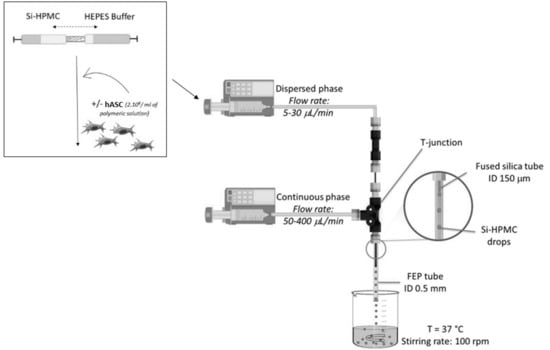 The droplet-based millifluidics device used to produce Si-HPMC particles. The control of temperature and stirring rate off-line in the collection bath were critical parameters that were optimized to avoid the coalescence of the particles and to maintain cell viability. The dispersed phase was comprised of Si-HPMC solution in the presence of freshly prepared HEPES buffer +/− loaded hASCs.