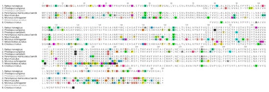 - Neumann, K.; Michaux, J.; Lebedev, V.; Yigit, N.; Colak, E.; Ivanova, N.; Poltoraus, A.; Surov, A.; Markov, G.; Maak, S.; et al. Molecular phylogeny of the Cricetinae subfamily based on the mitochondrial cytochrome b and 12S rRNA genes and the nuclear vWF gene. Mol. Phylogenet. Evol. 2006, 39, 135–148. [Google Scholar] [CrossRef] [PubMed]