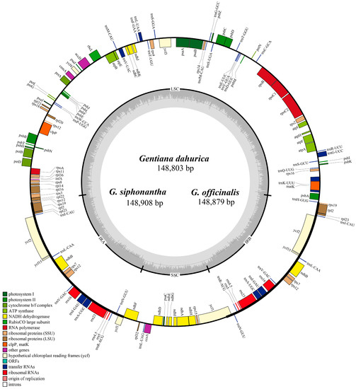 Merged gene map of the complete chloroplast genomes of three Gentiana species. Genes belonging to different functional groups are classified by different colors. The genes drawn outside of the circle are transcribed counterclockwise, while those inside are clockwise. Dashed area in the inner circle represent GC content of chloroplast genome.