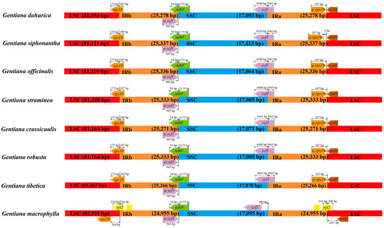 The chloroplast genomes of G. dahurica, G. siphonantha, and G. officinalis were sequenced with approximately 5.2, 5.8, and 5.6 Gb of paired-end reads, respectively. The raw reads with a sequence length of 125 bp were trimmed to generate the clean reads for the next assembly. After quality filtering, 10,114,902, 11,405,694, and 11,288,676 clean reads were recovered for G. dahurica, G. siphonantha and G. officinalis, respectively. Combined with the de novo and reference guided assembly, the cp genomes were obtained. The four junction regions between the IRs and SSC/LSC regions were confirmed by PCR amplification and Sanger sequencing. We mapped the obtained sequences to the new assembled genomes and no mismatch or InDel was observed. We compared the basic genome features of three newly sequenced cp genomes with five previously published cp genomes [26,27,28] and found that all the chloroplast genomes possessed the typical quadripartite structure with the length range from 148,765 to 149,916 bp (Table 1, Figure 1). The whole cp genome contained a pair of inverted repeat regions (IRs: 24,955–25,337 bp) which were separated by a small single copy region (SSC: 17,070–17,095 bp) and a large single copy region (LSC: 81,119–82,911 bp) (Table 1). Although genomic structure and size were highly conserved in eight cp genomes, the IR/SC boundary regions still varied slightly (Figure 2). All the eight chloroplast genomes contained 112 unique genes arranged in the same order, including 78 protein-coding genes, 30 tRNA genes, and 4 rRNA genes. Two genes (rps16, infA) were inferred to be pseudogenes (Figure S1). The overall guanine and cytosine (GC) content in each chloroplast genome is identically 37.7% (Table 1).