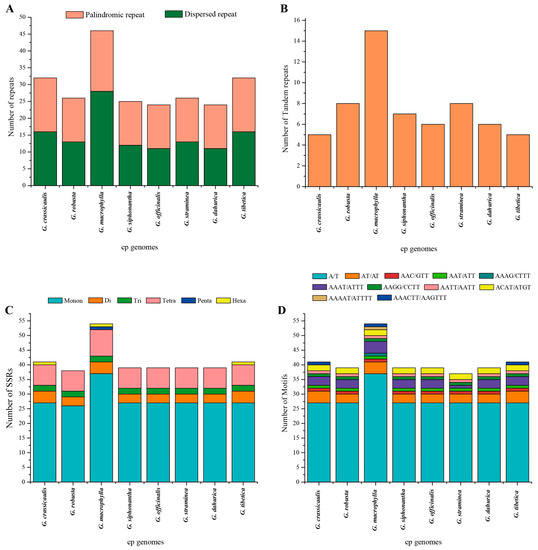 Analysis of different repeats in eight chloroplast genomes of Gentiana sect. Cruciata. (A) Histogram showing the number of palindromic repeats and dispersed repeats; (B) histogram showing the number of tandem repeats; (C) number of different simple sequence repeat (SSR) types detected in eight chloroplast genomes; (D) total numbers of different SSR motifs in eight chloroplast genomes.