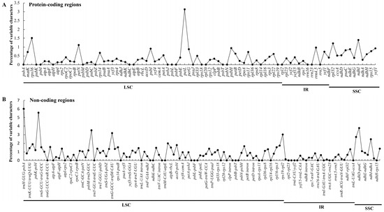 Percentage of variable characters in eight aligned chloroplast genomes of Gentiana sect. Cruciata. (A) Coding region; (B) Noncoding region.