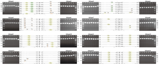 Based on the alignment of complete cp genome sequences, the 16 most InDel-variable loci were selected as candidate DNA markers for authentication (Table S5). After PCR amplification, these 16 markers could successfully amplify the expected polymorphic band sizes (Figure 6). Some of these 16 markers had unique amplicon sizes specific to different Gentiana species (Figure 6). Especially five markers (QJcpm9, QJcpm12, QJcpm14, QJcpm15, and QJcpm16) were specific to G. crassicaulis, which all derived from long InDels in the intergenic regions including rps16-trnQ, psbM-trnD, trnS-psbZ, accD-psbI, and trnK-rps16. The marker QJcpm1 was specific to G. robusta and G. crassicaulis and was derived from a 54 and 64 bp InDel in the ndhC-trnV region. The QJcpm2 marker derived from 14 bp tandem repeat (TR) in cemA-petA region was specific to G. siphonantha and G. crassicaulis. QJcpm3 marker, which was specific to G. officinalis and G. crassicaulis, was derived from 72, 14 bp InDels, and 7 bp TR in rbcL-accD region. Three markers (QJcpm4, QJcpm10, and QJcpm11) were specific to G. straminea, G. robusta, and G. crassicaulis. QJcpm4 marker was derived from 12 bp InDels and 6 bp TR in the rpl33-rps18 region; QJcpm10 marker was derived from 9 bp TR and 33 bp InDel in the trnT-psbD; QJcpm11 marker was derived from 18 bp InDel in rrn5-trnA region. The QJcpm5 marker, which was derived from 14, 4, and 7 bp TR in atpB-rbcL, was specific to G. macrophylla, G. robusta, and G. crassicaulis. Three markers QJcpm6, QJcpm8, and QJcpm13 were derived from a 42 bp InDel in ycf1, 9 bp InDel in rps8-rpl14 region, and 24 bp TR in the trnS-trnG region, respectively, and were specific to G. straminea and G. robusta. The marker QJcpm7, which was specific G. dahurica and G. siphonantha, was also derived from 24 InDel in ycf1 CDS region. Our validation results indicated all these markers can be used to identify species in sect. Cruciata.