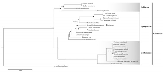 - Yang, L.L.; Li, H.L.; Wei, L.; Yang, T.; Kuang, D.Y.; Li, M.H.; Liao, Y.Y.; Chen, Z.D.; Wu, H.; Zhang, S.Z. A supermatrix approach provides a comprehensive genus-level phylogeny for Gentianales. J. Syst. Evol. 2016, 54, 400–415. [Google Scholar] [CrossRef]