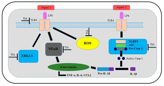 - Fan, Z.; Liang, Z.; Yang, H.; Pan, Y.; Zheng, Y.; Wang, X. Tenuigenin protects dopaminergic neurons from inflammation via suppressing NLRP3 inflammasome activation in microglia. J. Neuroinflamm. 2017, 14, 256. [Google Scholar] [CrossRef] [PubMed]