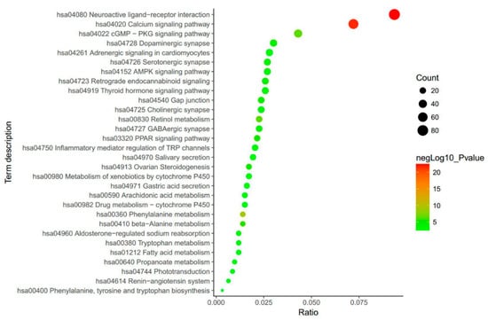 The results from searching in the BATMAN database showed that the biological mechanisms of SCF are mostly linked to neurologically related functions (Figure 1). Of the top 15 biological terms, 11 are strongly linked to mental functions, namely, neuroactive ligand–receptor interaction, the calcium signaling pathway, the cGMP-dependent protein kinase (cGMP-PKG) signaling pathway, dopaminergic synapse, serotonergic synapse, the adenosine monophosphate activated protein Kinase (AMPK) signaling pathway, retrograde end cannabinoid signaling, gap junctions, cholinergic synapses, the peroxisome proliferators activated receptor (PPAR) signaling pathway, and inflammatory mediator regulation of transient receptor potential (TRP) channels. The results indicated that SCF and its bioactive ingredients could potentially be treatments for NDs.
