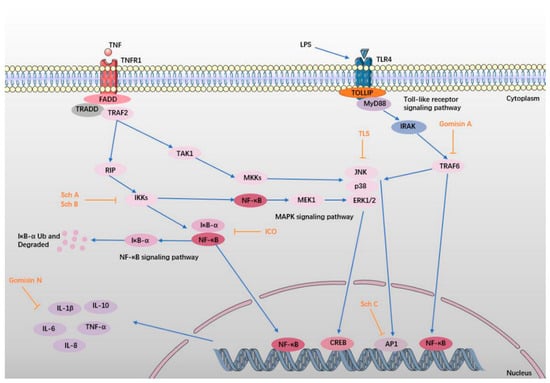 Song et al. reported that Sch A can exert anti-inflammatory and neuroprotective effects on LPS-induced inflammatory injury in microglia (BV2 cells) and neurons. The potential molecular mechanism may be the inhibition of the tumor necrosis factor-associated factor 6(TRAF6)- inhibitory kappa B kinase (IKK)β/ nuclear translocation of nuclear factor-κB (NF-κB) and Janus kinase-2/signal transducer and activator of transcription-3 (Jak2/Stat3) signaling pathways [].