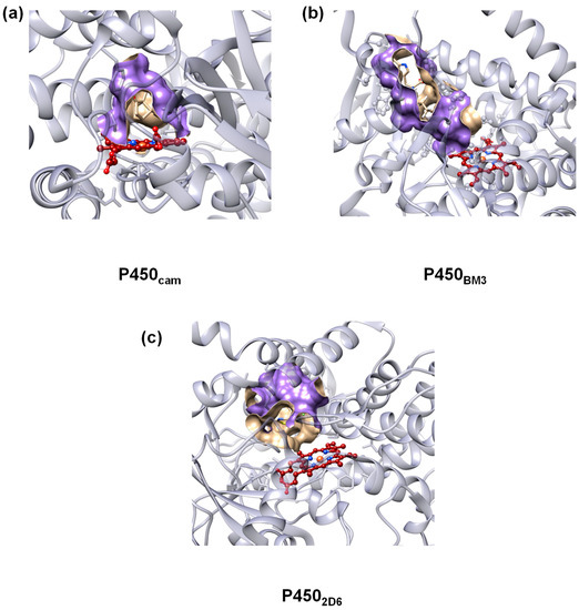 To accommodate for the substrate versatility, the P450s have a substrate binding pocket with a size that is dependent on the P450 isozyme. Thus, P450cam [14,15,16], which is a camphor hydroxylating P450 isozyme where atom C5 of the substrate is regioselectively hydroxylated, has a binding pocket that tightly binds camphor in a specific orientation that enables this selective reaction. To illustrate the size and shape of the substrate binding pocket in P450 isozymes, we show in Figure 1 the crystal structure extracts of protein databank (pdb) files for P450cam (2CPP pdb [17]), P450BM3 (3WSP pdb [18]) and P4502D6 (5TFT pdb [19]). P450BM3 binds long chain fatty acids and hydroxylates these at one of the carbon atoms in the terminus, whereas P4502D6 has a more spherical substrate-binding pocket as it is involved in the biodegradation of xenobiotics in the liver. These P450 isozymes, therefore, have distinct and different substrate binding pockets to accommodate for the substrate-types they activate.