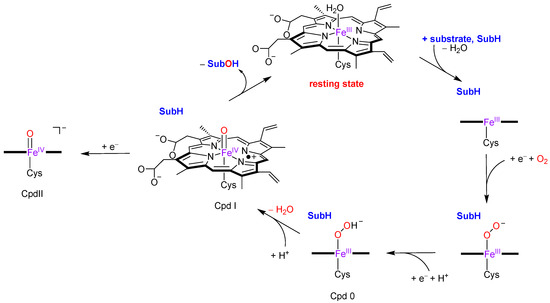 The consensus catalytic cycle of P450 enzymes is schematically depicted in Figure 2 [20,21,22]. The cycle starts from an iron (III)-water bound heme structure, the resting state, that upon substrate (SubH) binding in the substrate binding pocket releases the water molecule. Then, iron (III) (heme)—SubH is reduced by the reduction partner and binds molecular oxygen as an iron (III)-superoxo, that is reduced again and protonated to form the iron (III)-hydroperoxo (heme) intermediate called Compound 0 (Cpd 0). The latter was trapped at low temperature and characterized with electron paramagnetic resonance studies [23]. A final protonation of Cpd 0 forms the most likely active species, namely Compound I (Cpd I), which was trapped and characterized by Rittle and Green [24] with UV-Vis absorption, electron paramagnetic resonance and Mössbauer spectroscopy. Cpd I reacts with aliphatic substrates through hydrogen atom abstraction followed by OH rebound to form alcohol product complexes (SubOH) [25,26,27]. After binding a water molecule, the intermediate returns to the resting state and is ready for the next catalytic cycle.