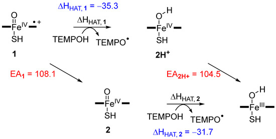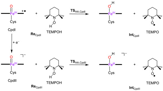 In principle, the hydrogen atom abstraction reaction from a substrate (TEMPOH) by Cpd I or [FeIV(O)(heme+•)Cys] gives an iron(IV)-hydroxo species and a radical rest group (TEMPO•) as described with Equation (1). Thermodynamically, the energy for Equation (1) (∆HEq1) is the difference in energy of the bond dissociation energy of the substrate O–H bond that is broken (BDEOH, TE), Equation (2), and the bond dissociation energy of the O–H bond of the iron (IV)-hydroxo complex that is formed (BDEOH,CpdI), Equation (3) [42,48,49,75,76,77,78,79,80,81,82]. As such the reaction energy for hydrogen atom abstraction from substrate by Cpd I (Equation (4)) can be described by individual bond dissociation energies BDEOH,TE and BDEOH,CpdI.