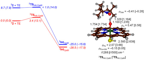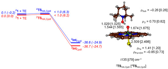 Hydrogen atom abstraction from substrate by Cpd I, typically fills the a2u orbital with a second electron. This usually [48,49,50,51,52] creates a hydrogen atom abstraction structure with a Fe–O–H angle of around 120°, i.e., gives a side-on approach of substrate on oxidant. Indeed, the transition states shown in Figure 4 for the reactivity of Cpd I show this side-on approach in line with the literature. An iron (IV)-hydroxo (porphyrin) complex is then formed in the doublet and quartet spin states with orbital occupation δx2-y22 π*xz1 π*yz1 a2u2 ΦSub1, whereby ΦSub is the radical on the substrate which is up-spin in the quartet spin state but down-spin in the doublet spin state. Indeed, the group spin densities show that the spin on the porphyrin ring drops from −1/ + 1 in 2Cpd I/4Cpd I in the reactants to −0.85/0.73 in 2TSHA,CpdI/4TSHA,CpdI, respectively (Figure 4). These values drop further to −0.15 and −0.13 for the radical intermediates with concomitant increase of spin density on the substrate moiety.