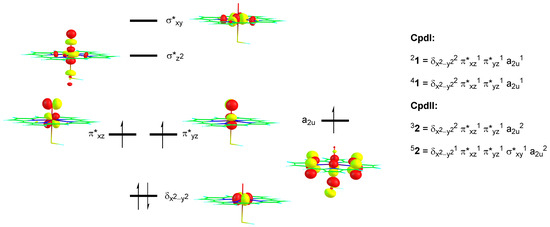 Orbital diagram of Cpd I and Cpd II with occupation in the relevant spin states.