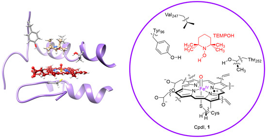 As shown in the previous section, the hydrogen atom abstraction transition states by Cpd I and Cpd II models are very different. While in the former case the substrate approaches from the side, in the latter case a top-approach is found. Obviously in enzymatic systems not always an ideal approach is possible due to the size and shape of the substrate binding pocket and often it is seen that enzymes catalyze stereoselective and regiospecific reaction mechanisms [53,54,55,56]. Furthermore, sometimes small model complexes do not reproduce the correct charge and spin distributions of the real P450 active site due to the absence of, for example, hydrogen bonding interactions to the axial thiolate group [57,58,59,60,61], and consequently full enzymatic approaches are more realistic. Indeed, it was shown previously that hydrogen bonding interactions toward thiolate can affect its charge and pull radical density away from the heme. Therefore, we decided to explore the hydrogen atom abstraction pathway by P450 Cpd I and Cpd II using QM/MM methods. Details of the methodology and set-up have been reviewed and explained in detail elsewhere [62,63]. In general, we take a pdb file from the literature, here 4JWU [64] was used, and modify it to create reactant complexes of either Cpd I + TEMPOH or Cpd II + TEMPOH. From the molecular dynamics simulation several snapshots were tested as starting structures for the QM/MM calculations. The choice of QM region is carefully considered and based on the bonds that are broken, hydrogen bonding interactions and salt bridges. A detailed explanation on how to set up a QM/MM calculation and what to consider as QM region is given in Ref [62]. The QM region used in the QM/MM calculations is displayed in Figure 7 and contained the heme without side chains, methylthiolate for the cysteinate axial ligand and the full TEMPOH substrate. In addition, the aromatic side-chain of Tyr96, the side chain of Val247 and a methanol group representing the Thr252 side chain were included in the QM region. In all places where the border between the QM and MM regions contains a chemical bond, we inserted link atoms (hydrogens).