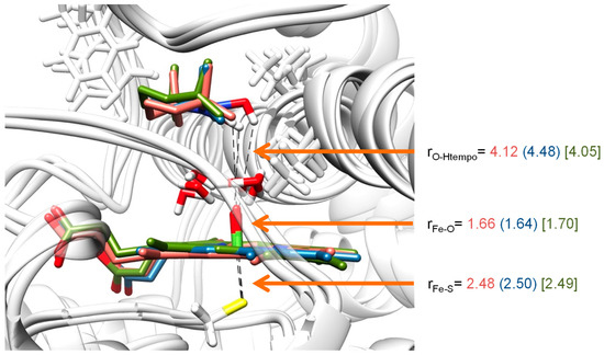 Figure 8 displays the optimized geometries of 2Cpd I as calculated with QM/MM for snapshots Sn250, Sn400 and Sn500 (see Material and Methods section for detailed information). The Fe–O distances vary slightly and range from 1.64 Å for Sn400 to 1.70 Å for Sn500, while the Fe–S distances are within 0.02 Å of each other. These distances are in agreement with the results of the small model complexes where generally Fe–O distances of ca. 1.64–1.66 Å and Fe–S distances of 2.50 Å were obtained for small model complexes as well as previous QM/MM studies on P450 Cpd I structures [65,66,67]. Furthermore, the experimental crystal structure coordinates and spectroscopic analysis also found Fe–O distances of Cpd I and Cpd II of heme enzymes in close proximity of our computational distances for related heme proteins [68].