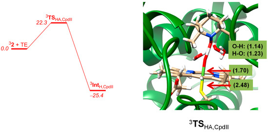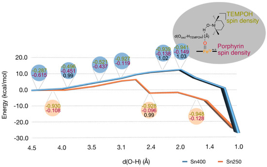 From the maximum points in the geometry scans of Figure 9, we attempted to locate transition states. However, the energetic fluctuation during the scan does not represent a barrier of a chemical reaction through bond breaking and/or bond forming, but is related to the structural reorganization in the substrate binding-pocket. In particular, during approach of the substrate on the oxidant, hydrogen bonding interactions are weakened with one group and strengthened with other groups. In addition, water molecules migrate in the substrate binding-pocket and also undergo hydrogen bonding interactions. As such caution should be taken when interpreting these geometry scans. Specifically, the maximum energy points are at a relatively long O–H distance of around 2 Å for Sn400 and 2.8 Å for Sn250. The O–H distances in the scan maxima structures are well longer than normally found in hydrogen atom abstraction transition states that are in the order of 1.2–1.4 Å [42,47,48,49,69,70,71,72,73]. Therefore, no proper hydrogen atom abstraction transition states could be characterized. Since the scan energy profile at short distances gives little evidence of a proper hydrogen atom abstraction barrier, it implies that also in the protein the hydrogen atom abstraction barrier from TEMPOH by Cpd I is negligible. Consequently, the small model complex captures the potential energy profile of hydrogen atom abstraction quite well and predicts negligible hydrogen atom abstraction barriers probably because the substrate fits into the substrate binding pocket well and can approach the oxidant under the ideal angle.