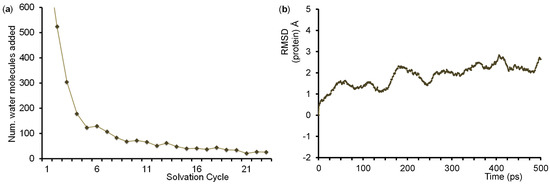 QM/MM set-up related graphics. (a) Number of water molecules added in each cycle of the hydration procedure to solvate the system. The number of water molecules added in step 1 using a 40 Å sphere box was 6454; (b) Changes in the root-mean-square deviation (RMSD), in Å, of the protein atomic positions over the course of the molecular dynamics simulation (picoseconds).