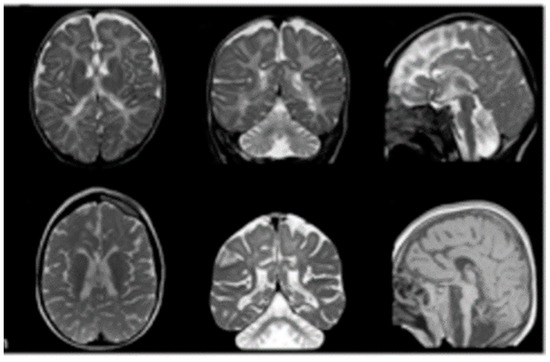 The child described here was first seen at the Paediatric Unit of the Santa Maria Hospital, Terni, Italy, when he was 3 years old. The hospital admission was required by parents for further evaluation of an already diagnosed EIEE. The child was born from eutocic delivery after a 39-week regular gestation. Neurological problems emerged during the first days of life when a significant hypertonus of the lower limbs was clearly evident. In the following weeks, repetitive, difficult-to-treat seizures occurred. Moreover, neuromotor and psychic development was very poor. At admission, the clinical manifestations included epileptic encephalopathy with tonic and myoclonic seizures and spasms refractory to polypharmacy, severe cognitive disability, and severe postural spastic paresis with a dystonic-myoclonic component (both cortical and truncal myoclonias at rest and in action). Magnetic resonance imaging (MRI) showed complex brain malformations such as pontocerebellar hypoplasia, corpus callosum atrophy and simplified cortical architecture (Figure 1). These characteristics were also associated with a posterior laryngomalacia. The child underwent tracheotomy and percutaneous gastrostomy because of his low aptitude for swallowing. Congenital cardiac cardiopathies were not observed at the cardiological consultation, and no congenital alterations were seen in renal ultrasound.
