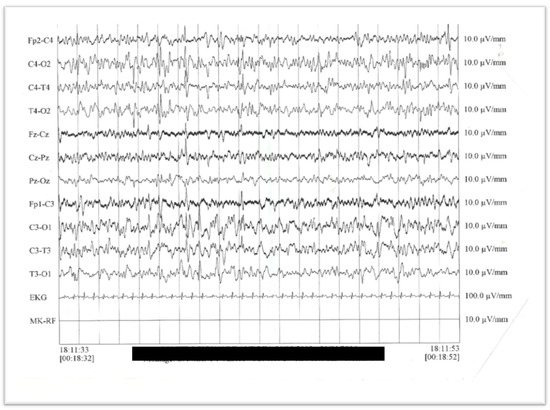 The patient has continued to show repeated daily critical episodes, characterized by a polymorphic tonic semeiology with an inconstant clonic component, tonic spasms in extension, tonic deviation of the head on the left and inflection adduction of the right upper limb, and clonus of the head and upper left limb. The electroencephalogram (EEG) showed a poorly organized pattern for the age of the subject. On the centro-temporal derivations of the two hemispheres, theta-delta band rhythms were present, followed by intermittent repetitions of sharp waves, mainly evident on the left hemisphere where they assume a subcontinuous morphology. The cortical electrical anomalies were evident in the centro-temporal areas of both cerebral hemispheres, especially on the left side (Figure 2).
