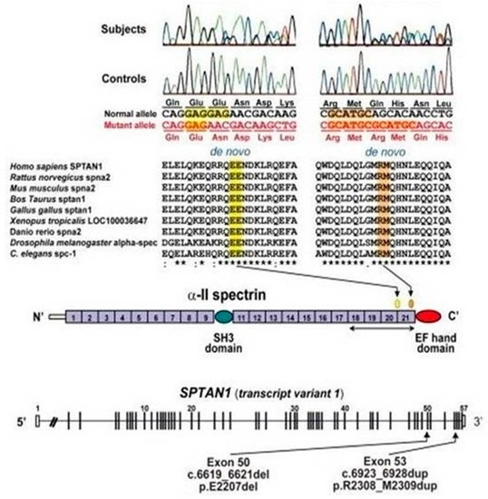 When he was 5 years old, clinical information and blood samples were obtained after approval from the Ethics Committee of Umbria Region and signed written informed consent by both parents. Genetic analysis was carried out using genomic DNA isolated from peripheral blood. A target resequencing method with a GS FLX Titanium 454 Roche platform was used. A heterozygous mutation, c.6923_6928dup, was located in the SPTAN1 gene. This alteration results in the duplication p.Arg2308_Met2309dup.