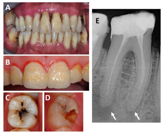 Frequent oral inflammations affecting the teeth, gingiva and the periodontium. (A) Shows an example of a severe case of periodontitis. Note the extensive loss of attachment and gingiva recession visible at most teeth; (B) shows a case of gingivitis. Note the soft plaque that covers the entire surface of the teeth and the gingiva reddened by the inflammation; panels (C,D) show examples of teeth affected by root caries, which often lead to the formation of endodontic lesions in the form of periapical abscesses, which can be detected on radiographs as shown in panel (E). Arrows mark the locations of periapical abscesses.