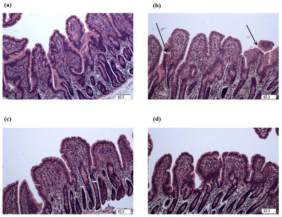 The 3 cm intestinal segment samples were cut into small pieces, not exceeding 2 mm, and enclosed into plastic tissue cassettes then processed over a 19 h period in an automatic tissue processor. Fixed intestinal samples were prepared according to the conventional paraffin-embedding techniques [66]. Samples were cut to 5 μm thickness and then stained with hematoxylin and eosin. Villus height and crypt depth were determined at 40× magnification using a microscope (Olympus CX31, Tokyo, Japan). Ten well-oriented and intact villi were selected at least. Villus height was defined from the tip of the villus to the villus–crypt junction, and crypt depth was obtained as the depth of the invagination between adjacent villi [3].