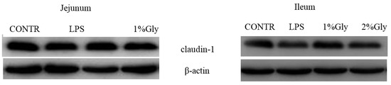 As shown in Table 3 and Figure 3, the piglets challenged with LPS had decreased claudin-1 protein abundance in the ileum, compared with the piglets in CONTR group (p < 0.05). However, there was no significant difference in claudin-1 protein abundance in the jejunum between CONTR and LPS group (p > 0.05). In addition, there was no significant effect on the intestinal claudin-1 protein abundance in the piglets fed diets supplemented with glycine (p > 0.05).