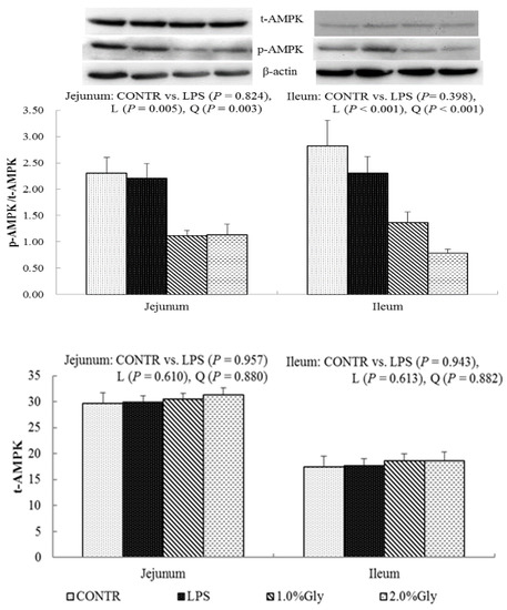 Effects of glycine supplementation on intestinal protein abundance of t-AMPKα and p-AMPKα after 4 h LPS challenge in weanling piglets. Note: L (linear), Q (quadratic).