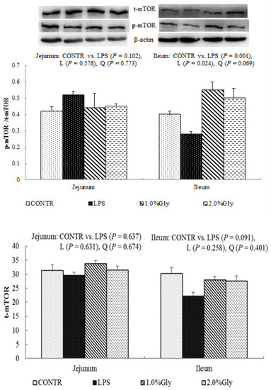 Effects of glycine supplementation on intestinal protein abundance of t-mTOR and p-mTOR after 4 h LPS challenge in weanling piglets. Note: L (linear), Q (quadratic).