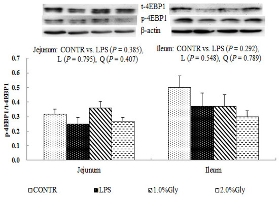 Among the LPS-challenged piglets, supplementation with glycine decreased the ratio of p-AMPKα/t-AMPKα both in jejunum and ileum (linear, p < 0.05; quadratic, p < 0.05; Figure 4). Relative to CONTR piglets, LPS challenge decreased the ratio of p-mTOR/t-mTOR in ileum (p < 0.05; Figure 5), while there was no difference in the ratio of p-mTOR/t-mTOR in jejunum between CONTR and LPS group (p > 0.05). As supplementation with glycine in the diets, the piglets challenged with LPS increased ratio of p-mTOR/t-mTOR in ileum (linear, p < 0.05). However, there was no effect of glycine or LPS on the ratio of t-AMPKα, t-mTOR, p-4EBP1, and t-4EBP1 in jejunum and ileum (p > 0.05; Figure 4, Figure 5 and Figure 6).