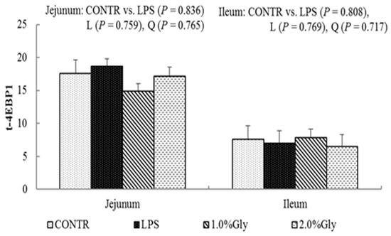 Effects of glycine supplementation on intestinal protein abundance of t-4EBP1 and p-4EBP1 after 4 h LPS challenge in weanling piglets. Note: L (linear), Q (quadratic).