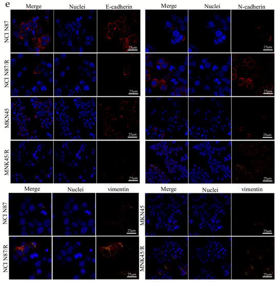EMT is of vital importance in many cancer-related biological events, which contributes to invasion, metastasis, and drug resistance of cancer [29]. When compared with parental cells, MKN45/R and NCI N87/R cells exhibited an EMT-like phenotype (Figure 1a,b). Immunofluorescence staining of β-tubulin also revealed the morphological change of NCI N87/R and MNK45/R cells (Figure 1c). Results of Western blot and immunofluorescence revealed that expression of epithelial marker E-cadherin was dramatically down-regulated while mesenchymal markers N-cadherin and vimentin were markedly up-regulated in MKN45/R and NCI N87/R cells when compared with their parental cells (Figure 1d,e). Moreover, EMT-related transcription factors, including snail1 and twist, were significantly up-regulated in trastuzumab-resistant cells (Figure 1d). These results suggest an EMT phenotypic conversion in resistant cells.