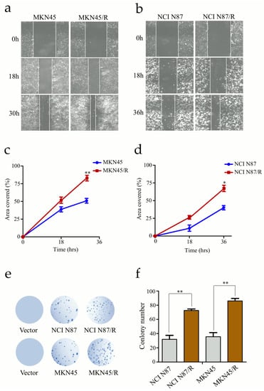 Trastuzumab resistant cells exhibit aggressive migration. (a,b) The confluent cell monolayers were wounded by scraping and the closure of the wounded areas was monitored. The images of the wounds were taken at different time points; (c,d) Migration activities were analyzed by measuring the distance cells traveled toward the center of the wound; (e,f) Colony formation assays were performed and colony numbers were counted and analyzed. All experiments were performed in triplicate. * p < 0.05, ** p < 0.01 vs. controls.