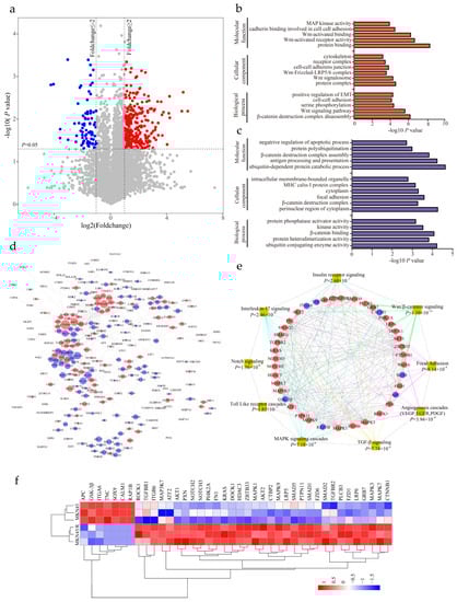 We performed paired two-tailed student’s t tests (the dataset showed a normal distribution (Figure S5) to identify differentially expressed proteins with statistical significance. A volcano plot elucidated differential protein abundance against the corresponding p value obtained from t test (Figure 3a, Table S3). Compared with MKN45, the quantitative values of 286 proteins (5.24% of the proteome) displayed a more than twofold increase in MKN45/R cells (p value < 0.05, and marked as red dots), whereas 211 proteins (3.86% of the proteome) showed more than twofold decrease in MKN45/R cells (p value < 0.05, and marked as blue dots). The rest of the 4964 proteins (90.90% of the proteome) were considered as no significant change. The increased and decreased proteins were subjected to gene ontology (GO) terms enrichment analysis by the WebGestalt (http://www.webgestalt.org). The enrichment analysis of up- or down-regulated proteins in cellular component, biological process and molecular function were shown in Figure 3b,c respectively. Notably, up-regulated proteins in MKN45/R cells were annotated as residing in protein complex, Wnt signalosome, Wnt-Frizzled-LRP5/6 complex and cell-cell adherens junction, whereas down-regulated proteins in MKN45/R cells were annotated as perinuclear region of cytoplasm, β-catenin destruction complex, and focal adhesion. Regarding biological processes, up-regulated proteins include those involved in regulation of β-catenin destruction complex disassembly, Wnt signaling pathway, serine phosphorylation, and positive regulation of EMT, while down-regulated proteins were mainly shown as ubiquitin conjugating enzyme activity, protein hetero-dimerization activity and β-catenin binding. With regard to molecular functions, upregulated proteins are enriched in protein binding, Wnt-activated receptor activity, Wnt-activated binding, and cadherin binding involved in cell-cell adhesion, whereas down-regulated proteins function in ubiquitin-dependent protein catabolic process, antigen processing and presentation, and β-catenin destruction complex assembly, etc. the STRING database (https://string-db.org/) was then utilized to uncover the relationship between the increased and decreased proteins. Interactions between them with high confidence (scores > 0.7) were shown using Cytoscape (v.3.6.0). Red and blue nodes represented up- and down-regulated proteins respectively, nodes with more than 10 interacting neighbors were displayed in large size while nodes with 5–10 neighbors were displayed in medium size. We noticed that CTNNB1, AKT1, Wnt3A, and MAPK represent main hubs formed by up-regulated proteins, and GSK-3β, Axin1/2, and UBE family proteins represented primary hubs formed by down-regulated ones (Figure 3d). Enrichment analysis displayed that some signaling pathways showed remarkable changes in MKN45/R cells, which are correlated with cancer metastasis, invasion and drug resistance, with main interaction nodes formed by components of Wnt/β-catenin (p = 1.10 × 10−11), insulin receptor (p = 2.68 × 10−7), interleukin-17 (p = 2.46 × 10−9), Notch (p = 1.56 × 10−6), Toll like receptor cascades (p = 1.85 × 10−7), MAPK cascades (p = 7.18 × 10−6), TGF-β (p = 7.74 × 10−6), angiogenesis cascades (p = 3.94 × 10−9), and focal adhesion (p = 8.14 × 10−4) signaling pathways (Figure 3e). Quantification of these proteins are represented in heat map (Figure 3f).