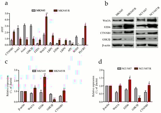 Validation of differentially expressed proteins in Wnt/β-catenin signaling pathway. (a) Twelve Wnt/β-catenin pathway components differentially expressed in MKN45/R and MKN45 cells were measured by mass spectrometry; (b) Expression of some Wnt/β-catenin pathway proteins detected by western blot. β-actin was used as a loading control; (c,d) Quantification of Western blot signals in two groups of cell lines. Three independent biological replicates were shown as mean ± SEM. * p < 0.05, ** p < 0.01 vs. control.