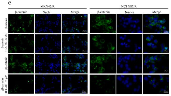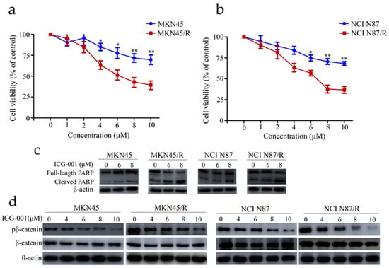 ICG-001 preferentially inhibited cell viability and phosphorylation of β-catenin and induced apoptosis in trastuzumab resistant cells. (a,b) Cells cultured for 24 h were either treated with or without ICG-001 at the indicated concentrations or (dimethyl sulfoxide) DMSO, which was set as control. Cell viability was determined by CCK-8 assay 72 h later. Results expressed as % control represented the mean of three experiments. * p < 0.05, ** p < 0.01 vs. controls; (c) Cells exposed to ICG-001 for 24 h under different concentrations of (0, 6, 8 μM) were analyzed by Western blot for full-length PARP and cleaved PARP, with β-actin being a loading control; (d) Cells were exposed to ICG-001 for 24 h at the indicated concentrations and with DMSO as control, and cell lysates were probed with phosphor- and total antibodies of β-catenin signaling pathway. β-actin was used as a loading control. The representative images were cropped and shown; (e) MKN45/R and NCI N87/R cells were treated with ICG-001 (6 μM) for 24 h and DMSO as control which was followed by collection for immunofluorescence. Nuclear staining was performed using DAPI (blue), and total β-catenin and phosphor β-catenin were stained by Alexa Fluor® 488-labeled secondary antibody (green). Slides were imaged using ×20 lens of Leica DMi8 fluorescent microscope.