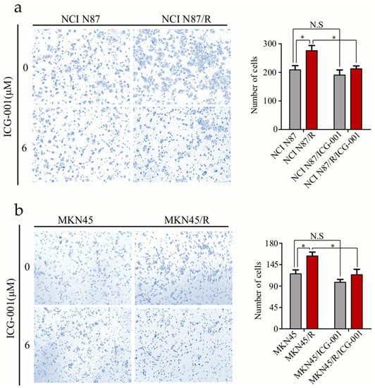 Cancer cells usually become more invasive after the acquisition of drug resistance. Here we evaluated how ICG-001 inhibited invasion of MNK45/R and NCI N87/R cells by transwell assays. Without ICG-001, more MKN45/R and NCI N87/R cells passed through the polycarbonate membrane than their parental cells (p < 0.05). However, with ICG-001 treatment, invasion of MKN45/R and NCI N87/R cells was remarkably inhibited (p < 0.05) while invasion of MKN45 and NCI N87 cells was not (p > 0.05) (Figure 6a,b). These results indicated that activation of Wnt/β-catenin pathway facilitates invasion of MKN45/R and NCI N87/R cells in vitro, and ICG-001 can preferentially inhibit the invasion of MKN45/R and NCI N87/R cells.